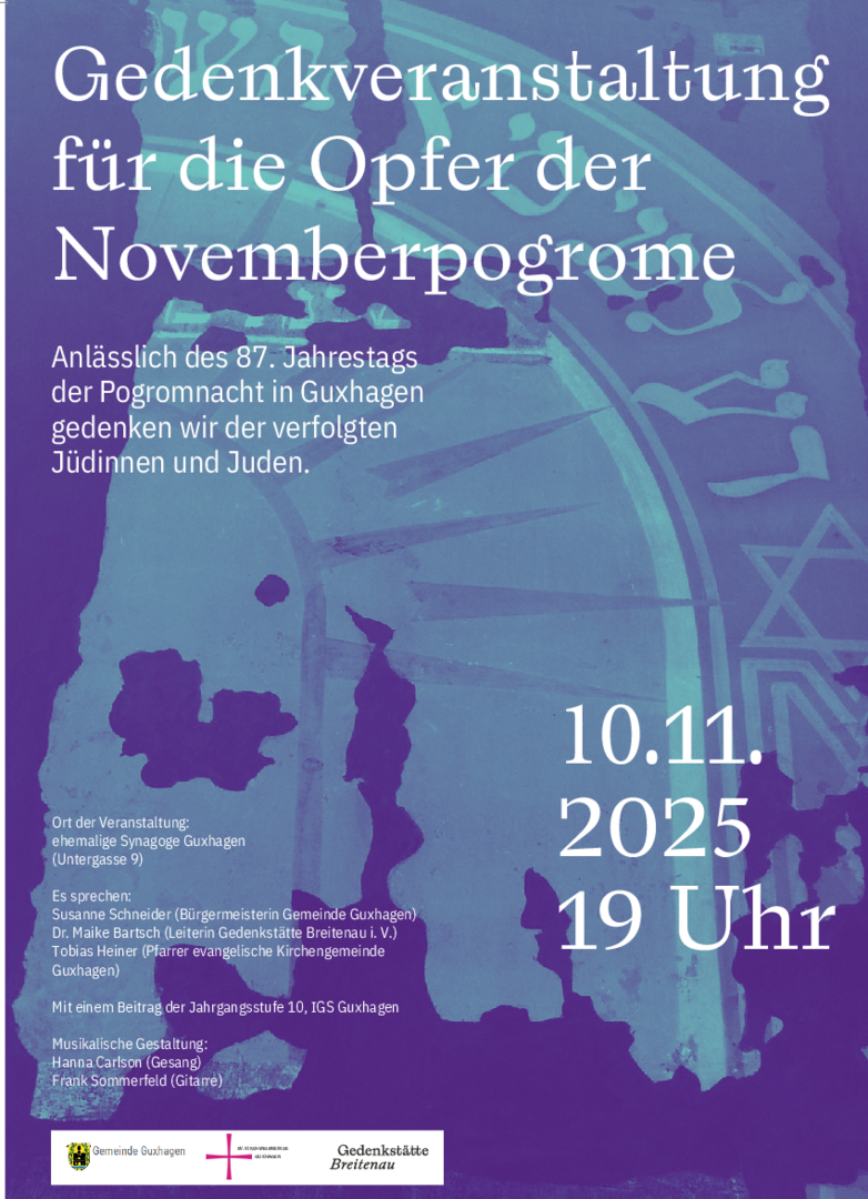 Die Gemeinde Guxhagen, die Gedenkstätte Breitenau und die evangelische Kirchengemeinde Guxhagen laden anlässlich des 87. Jahrestages der Novemberpogrome zu einer Gedenkfeierlichkeit ein.