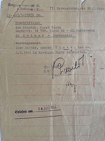 Amanda Tietz wird zunächst in das Polizeigefängnis Leipzig und am 2. Mai 1944 zusammen mit 54 weiblichen Häftlingen in das Konzentrationslager Ravensbrück verbracht, wo sie unter der Häftlingsnummer 37632 registriert und in Block 9 untergebracht wird. Ihr Sohn, dem im Juli 1944 ein Sonderbrief vom KZ Buchenwald in das KZ Ravensbrück genehmigt wird, erhält von dort am 20. Juli 1944 die Mitteilung, dass seine „Mutter Amanda Tietz am 5. Juni 1944 im hiesigen Lager verstorben“ sei. Die näheren Umstände ihres Todes bleiben trotz intensiver Nachforschungen unbekannt.