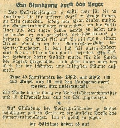 Das „Konzentrationslager für politische Schutzhäftlinge“ wird in die Landesarbeitsanstalt Breitenau integriert. Es untersteht dem Polizeipräsidenten in Kassel, auf dessen Initiative das Lager eingerichtet wird. Die Wachmannschaften setzen sich aus Hilfspolizisten zusammen, die zunächst aus der SA, und nach deren Abzug aus der SS rekrutiert werden. Bei den SS-Männern handelt es sich um Mitglieder des „Sondersturm Renthof“ in Kassel. Diese SS-Eliteeinheit wird von Karl Otto Koch geleitet, dem späteren Kommandanten der Konzentrationslager Esterwegen, Buchenwald und Majdanek.