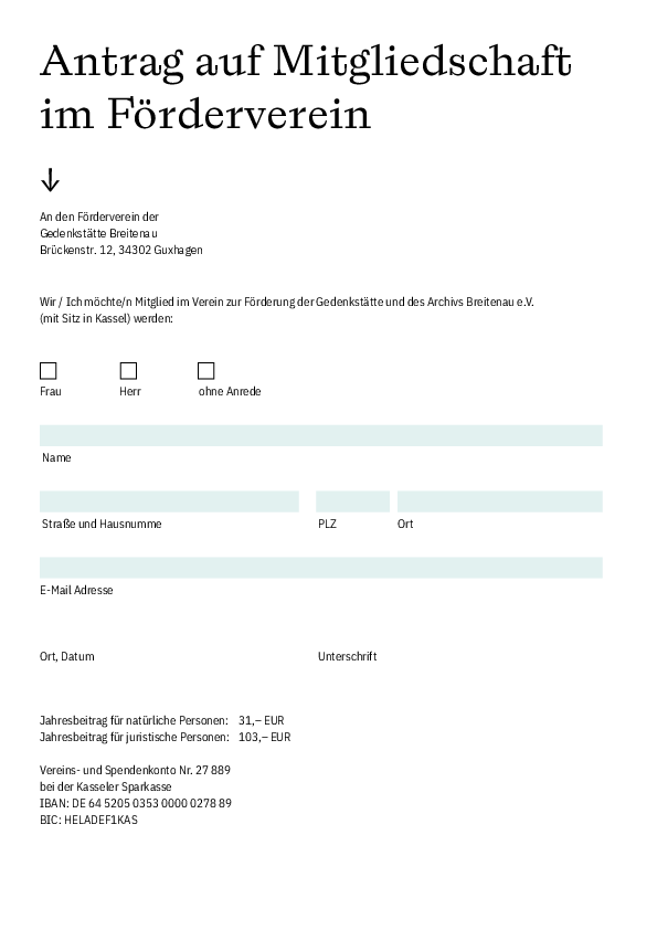 Wir laden Sie ein, Mitglied im Förderverein zu werden, um damit die Arbeit der Gedenkstätte Breitenau aktiv zu unterstützen. Der Jahresbeitrag für Einzelpersonen beträgt 31,– EUR, der Jahresbeitrag für Verbände und Institutionen 103,– EUR.